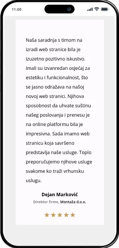 Naša saradnja s timom na izradi web stranice bila je izuzetno pozitivno iskustvo. Imali su izvanredan osjećaj za estetiku i funkcionalnost, što se jasno odražava na našoj novoj web stranici. Njihova sposobnost da uhvate suštinu našeg poslovanja i prenesu je na online platformu bila je impresivna. Sada imamo web stranicu koja savršeno predstavlja naše usluge. Toplo preporučujemo njihove usluge svakome ko traži vrhunsku uslugu.